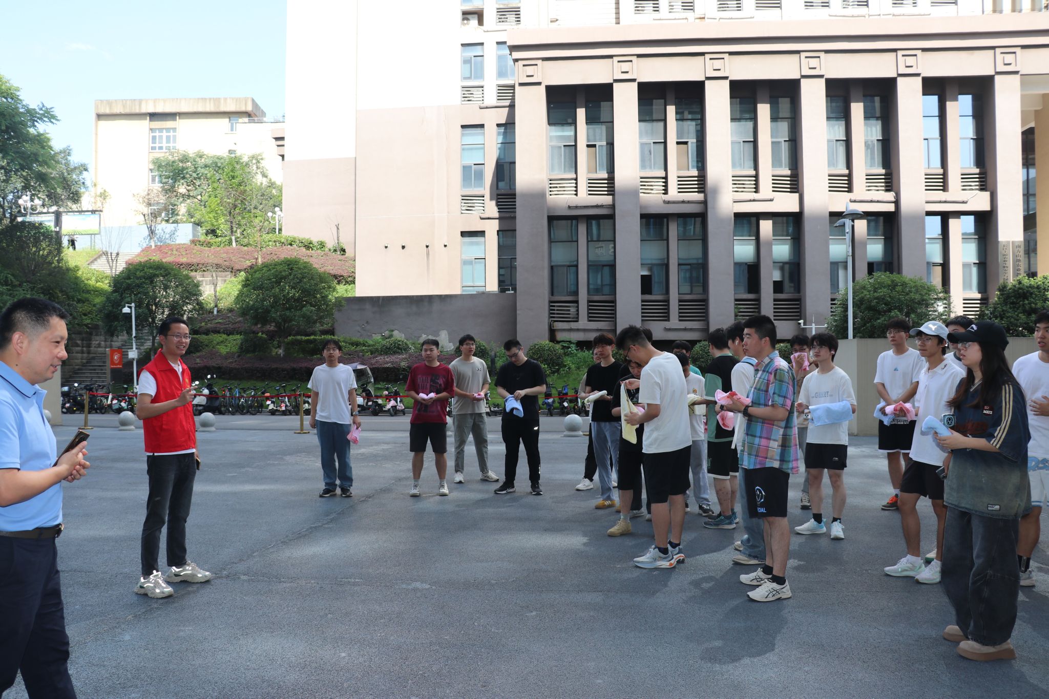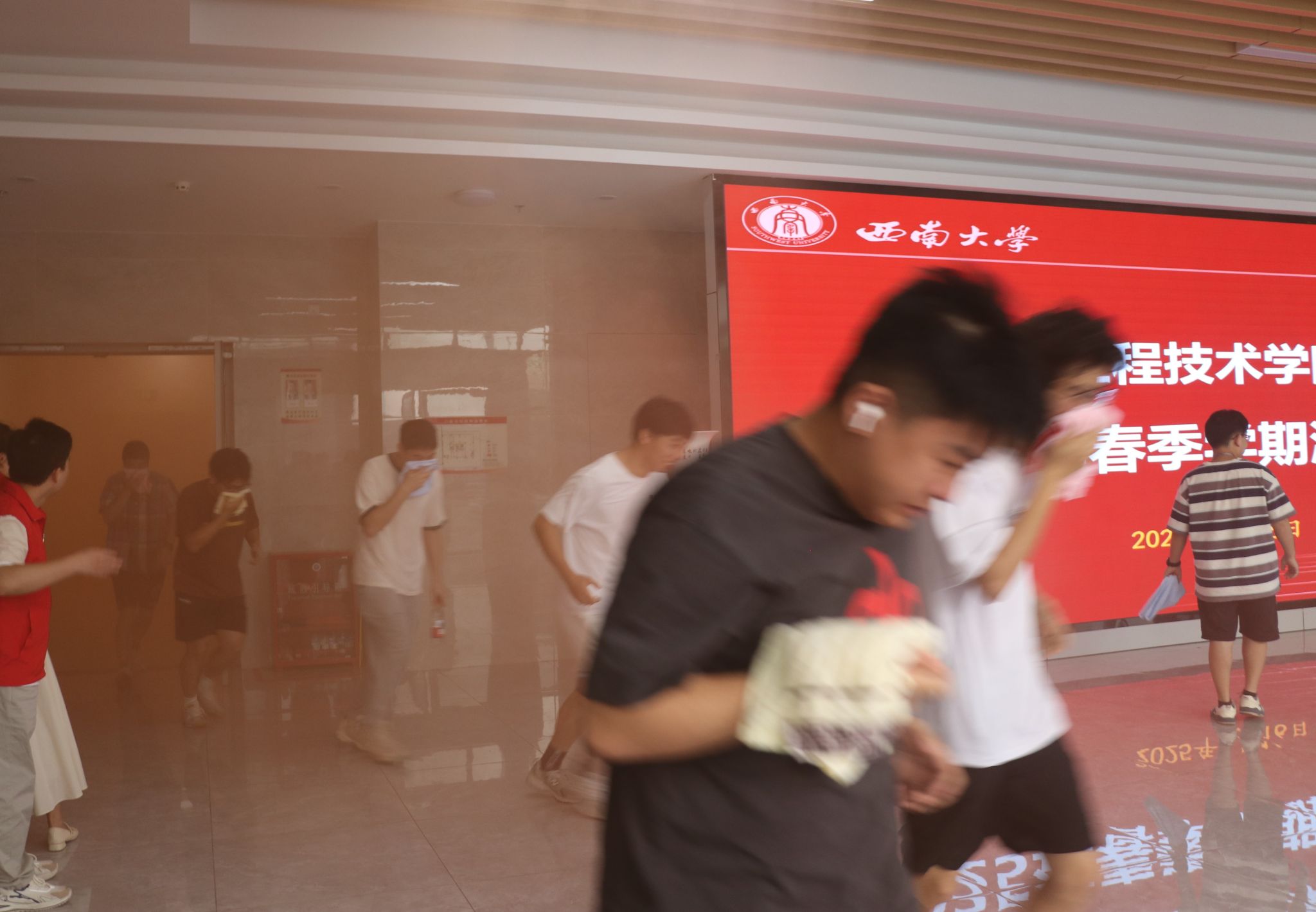 10:00整,随着飘出的滚滚“浓烟”,各楼层学生在辅导员组成的消防志愿队的引导下,用打湿的毛巾捂住口鼻,按照预定的疏散路线快速、有序地撤离至一楼广场。各年级负责人立即清点人数,确保每一位同学都已安全撤离。