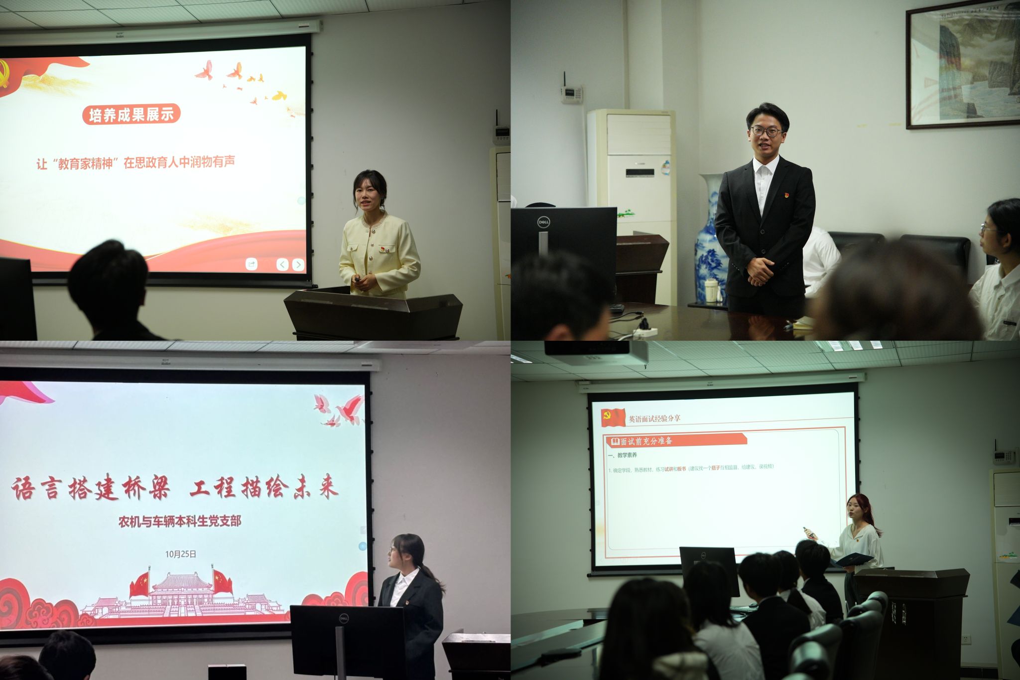 在交流环节,杨安琪同志和盖小菲同志先分别作了各自党支部的情况介绍。农机与车辆本科生党支部书记刘丹同志作“让教育家精神在思政育人中润物有声”交流分享,她以"2024届本科生党员杨敬升捐赠奖学金"为例,阐述了PA视讯集团在本科人才培养方面落实立德树人根本任务,特别是强化“教育家精神”在增强学生社会责任感和奉献精神中的一些做法,激励大家成为心怀感恩、挺膺担当的新时代青年表率。