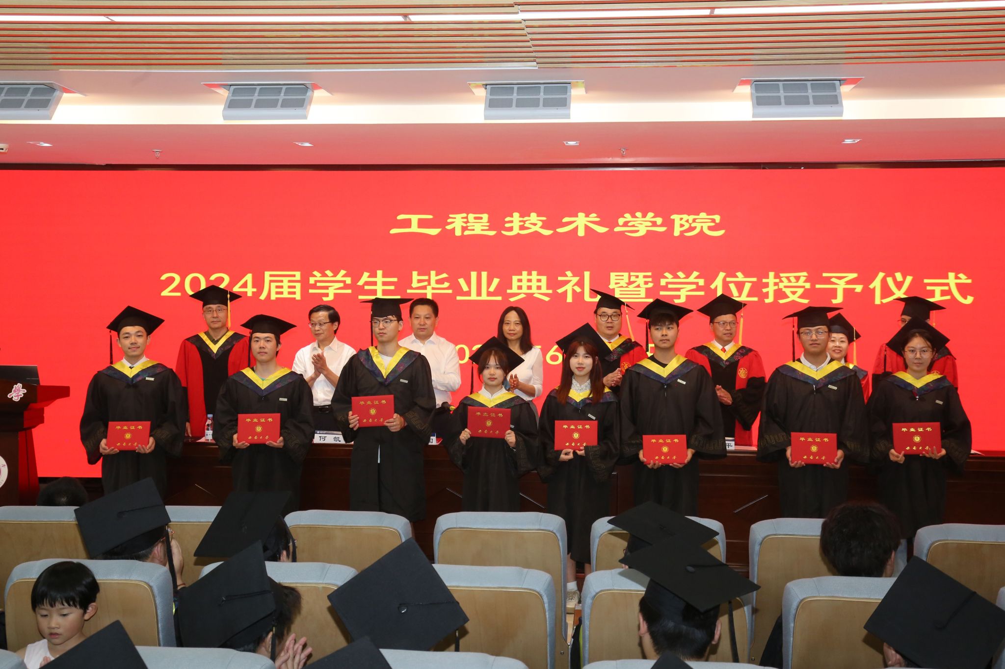 副院长、学院学术委员会副主席祝诗平教授宣读了西南大学关于2024年准予授位的决定。毕业生们依次上台,院学术委员会委员为他们一一拨穗授位,全体在场师生共同见证了这一难忘时刻。