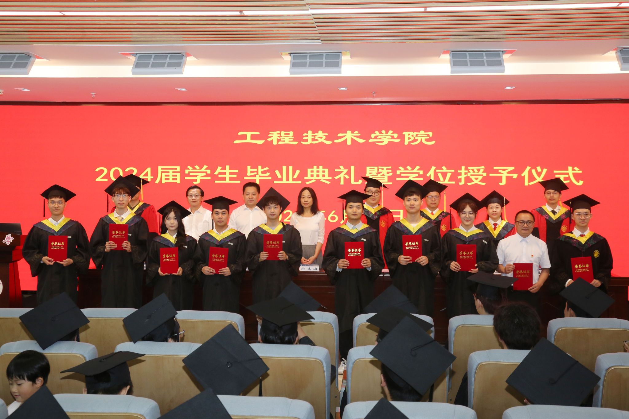 主席台就坐领导和老师为优秀毕业生代表颁发荣誉证书、为毕业生代表颁发毕业证书。