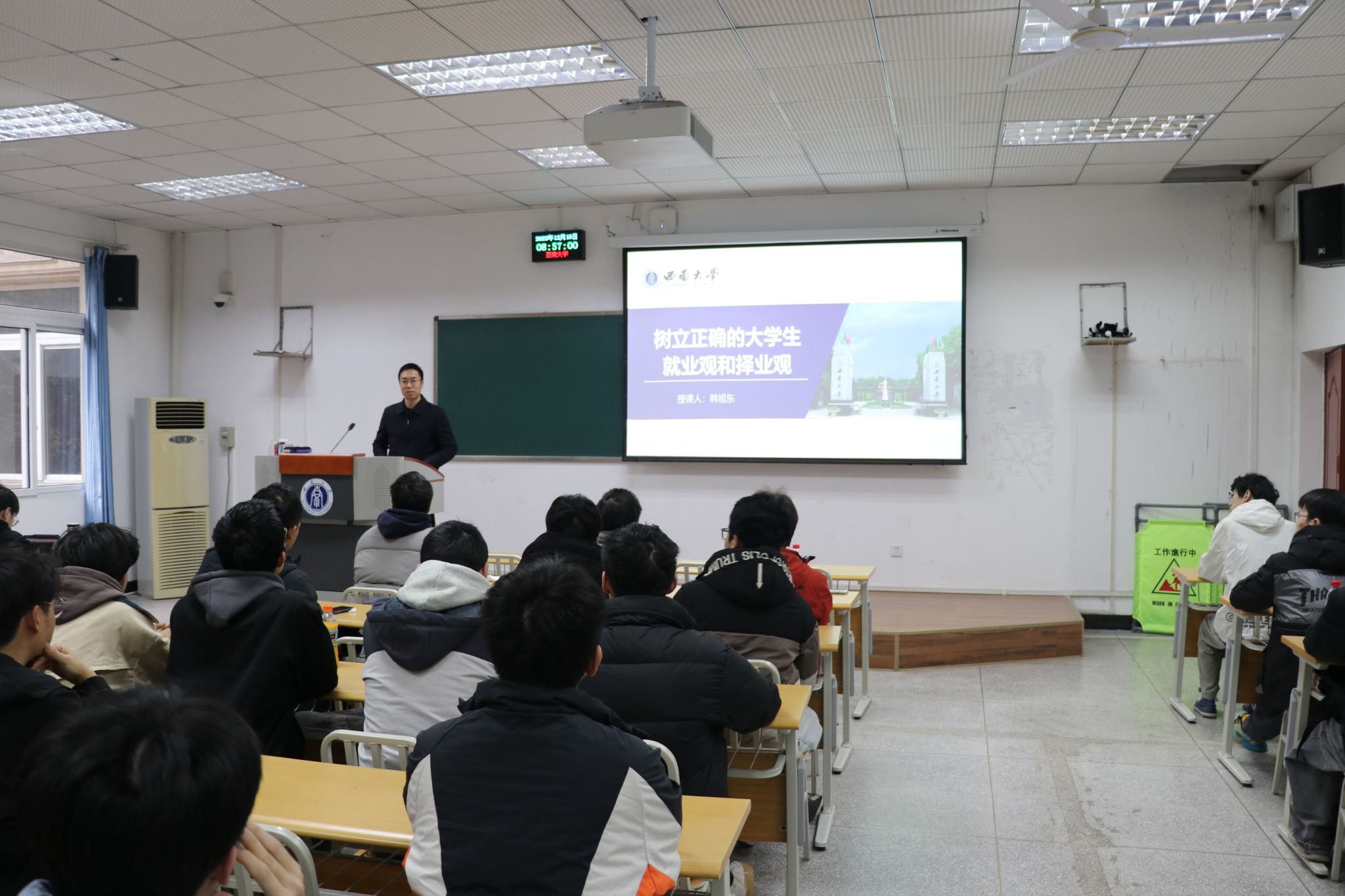 韩旭东副校长从“如何看待大学生就业难”“对就业前景的信心何来”“党和政府促进大学生就业的政策举措有哪些”三个问题入手,通过严谨的逻辑、生动的语言、详实的数据、鲜活的案例为同学们讲述了当前大学生的就业形势、就业规划和就业路径。他指出,面对激烈的竞争环境和当前的就业压力,同学们要树立积极心态,充分发挥自身的优势,努力提升自己的综合素质,勇敢面对激烈就业市场的挑战。关于就业规划,他强调大学生应该具备正确的职业规划和目标,了解当前社会的发展趋势和行业需求,通过持续学习、提升专业技能和实习实践经验来增强自己的竞争力,只要坚持不懈,努力一定会有好的回报。最后,韩旭东副校长为同学们介绍了国家和学校出台的支持大学生就业创业系列政策和措施,希望同学们主动了解并利用好这些政策,争取获得更多更好的就业机会。