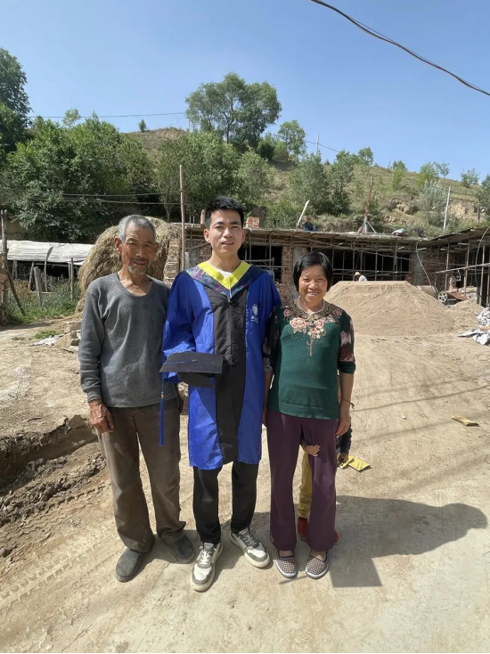 张小亮在个人社交平台上分享的照片中,还有一张他本科毕业时穿学士服和父母的合照。那时候,他和父母站在家里的土坯屋前。而这次硕士毕业合影时,以前的土坯屋没有了,他和父母就站在正在修建的屋子前面拍照。
