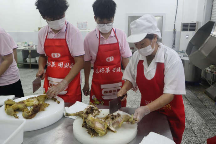 (图为实践团成员在工作人员指导下学习制作麻辣鸡)
