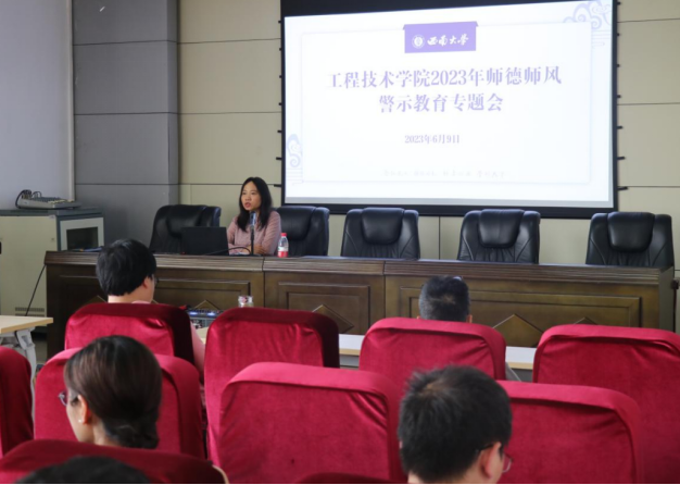 培训会上,古文海、陈富国传达了学校关于2023年毕业季期间进一步严守师德规范的通知,组织全体教职工集中学习了《新时代高校教师职业行为十项准则》《西南大学研究生导师指导行为准则》等文件精神,通报了《教育部公开曝光违反高校教师职业行为事项准则典型案例(摘编)》及近期学校师德失范案例。通过学习文件精神、剖析反面案例,进一步强化了全体教职工对师德师风建设重要性、必要性的认识,进一步巩固了全体教职工对照师德师风规范和典型案例自查自纠的思想和行动自觉。