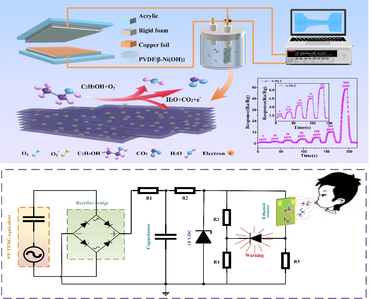 NNES系统基于β-Ni(OH)2@PVDF摩擦纳米发电机(NP-TENG)自适应采集环境机械能,集成式驱动β-Ni(OH)2/MXene气敏传感单元,实现痕量级乙醇气体监测。通过探究β-Ni(OH)2/MXene气敏传感机理、重构复合材料微纳表面、优化气敏传感单元与NP-TENG的阻抗匹配,协同增强了NNES的气敏响应性能。在室温26°C、相对湿度87%的条件下,NNES对乙醇气体的检测范围可达0~500ppm,对100ppm的乙醇气体具有出色的响应(~6.67)和快速响应/恢复时间(15s/4s),如图1所示。基于NNES构建的便携式自驱动乙醇报警系统,实现了乙醇气体浓度在线监测与超阈值报警功能,具有广泛的实际应用意义。