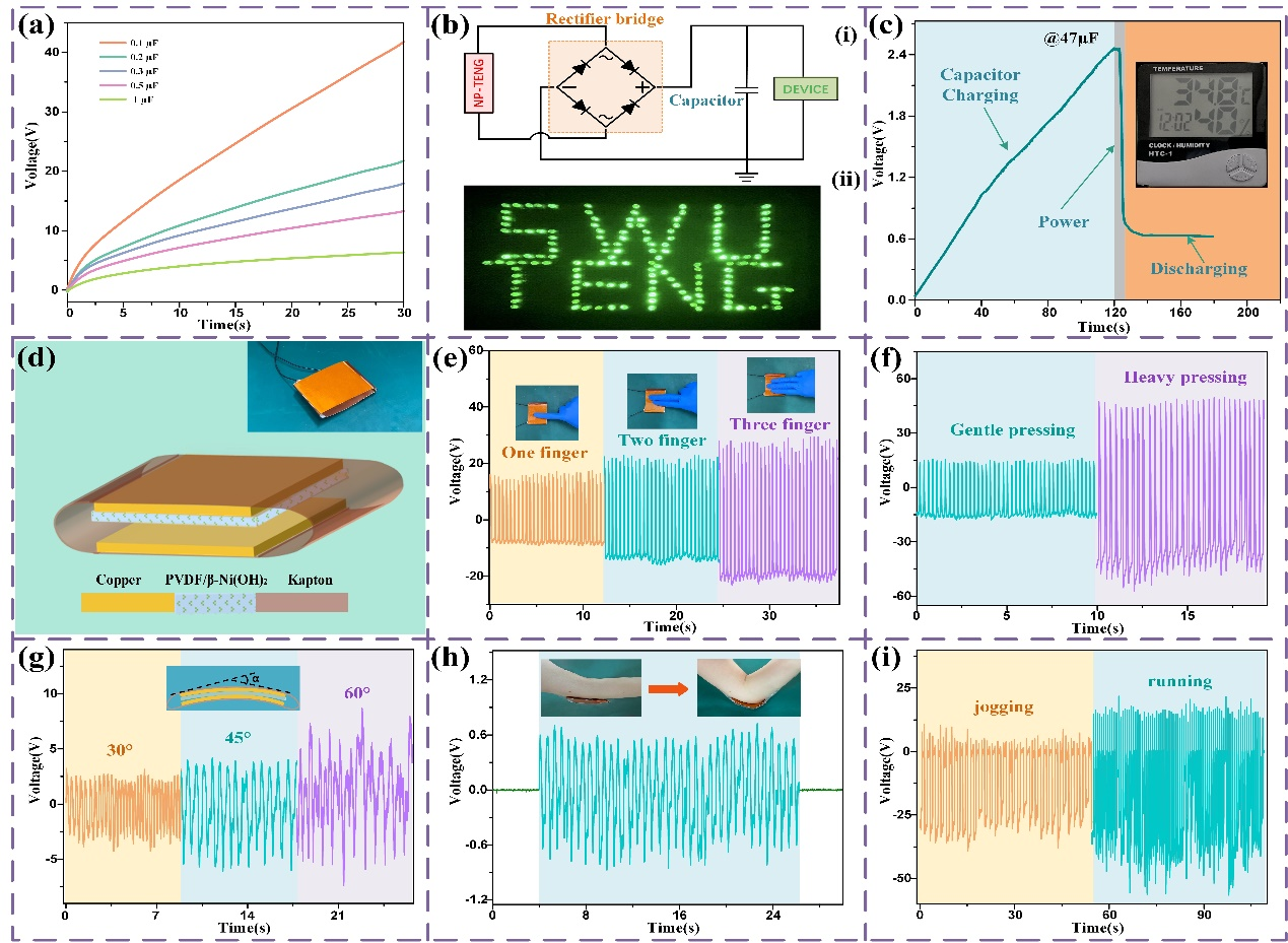 图2. (a) 不同电容器的电压充电曲线。(b) ⅰ.用于驱动微电子器件的电路原理图;ⅱ. 以"SWU TENG"模式串联的LED可以由NP-TENG点亮。(c) 用于驱动温、湿度计的电容器的充电/放电特性曲线。(d) 用于人体运动检测的柔性NP-TENG的结构示意图。插图:柔性NP-TENG的实物图。(e) 用不同数量的手指按压NP-TENG时的输出电压。(f) 用不同力度按压时NP-TENG的输出电压。(g) 柔性NP-TENG在不同弯曲角度下的电压输出。柔性NP-TENG在人体各部位的运动检测应用:(h) 肘部和(i) 脚部。