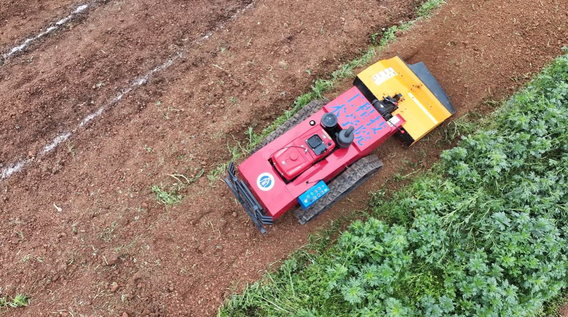 学院师生针对丘陵山区田块分散、机耕道狭窄、地形坡度较大的现实条件,历经50多次田间试验、10多次迭代改良,自主研发生产出新一代遥控式机电液一体化复合型旋耕机。它整机接地面积大,可有效减轻土壤压实,同时具备良好的防滑能力;窄间距履带能够适配丘陵山区绝大多数机耕道,搭配大功率双直流无刷行走电机,可实现25°以内坡地稳定行驶,有效克服了地形限制,实现了高效、精准的“智慧”耕整,为农户抢抓了宝贵农时。